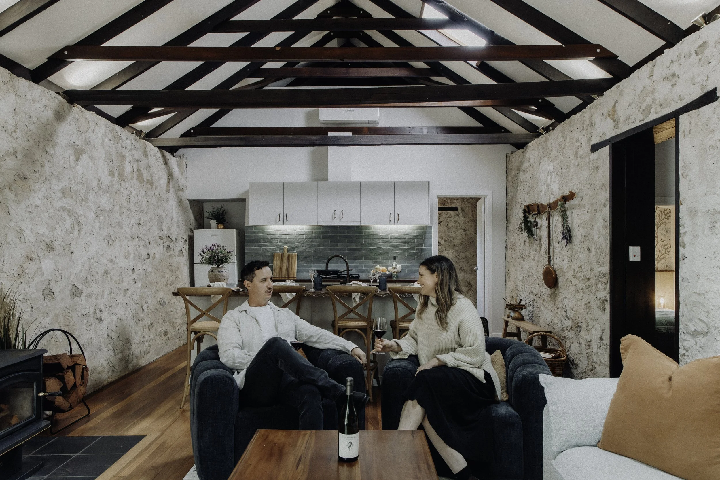 Our two-bedroom converted barn with charming rustic features, kitchen, bathroom, generous living area and outdoor entertaining space.